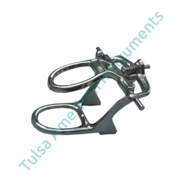 FULL DENTURE CHROMIUM PLATED ARTICULATOR. PROVIDES ADDITIONAL VERTICAL DIMENSION FOR ACCEPTANCE OF HIGHER MODELS. 49 WIDE AT THE JOINT & HAS A VERTICAL SPAN BETWEEN PARALLEL BOWS OF 25/8\\\"